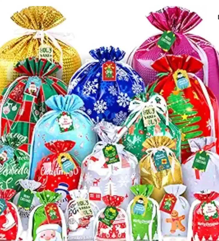 FESTIVE HOLIDAY DESIGNS: Our Christmas drawstring gift bags assorted sizes feature charming Christmas patterns, such as Christmas trees, gingerbread men,