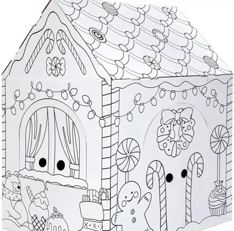 Complete DIY Gingerbread House Kit: This color your own cardboard gingerbread house includes a sturdy, giant cardboard playhouse (40″ x