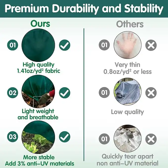 • Premium Material: Crafted from 40gsm thick, heavy-weight (1.41 oz/sq. yard) non-woven fabric, this frost plant cover garden freeze protection cover is breathable, lightweight, and durable. The premium construction ensures optimal heat retention and provides excellent protection against weather elements, pests, and birds while allowing plants to breathe and remain healthy